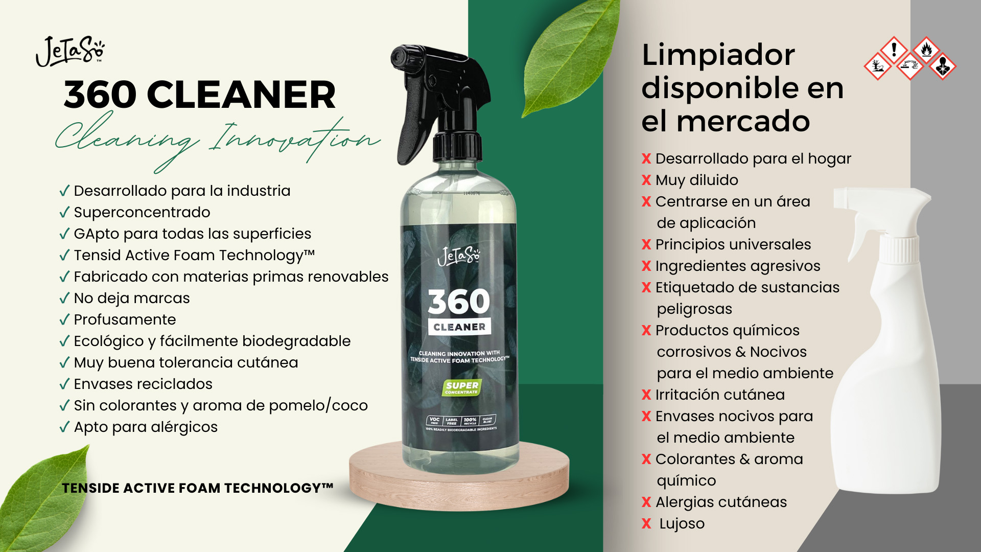 Innovadora Tecnología de Espuma Activa Surfactante™. Gracias a la innovadora Surfactant Active Foam Technology™, este superconcentrado es una innovación de limpieza con el poder de la naturaleza. - JeTaSo™ 360 CLEANER es altamente eficaz porque fue desarrollado para satisfacer las demandas de la industria y la limpieza profesional. - Responde incluso a retos contradictorios: Superficies duras, superficies blandas, grasa, cal, manchas nuevas, manchas viejas. Todo lo que tenga una superficie lavable con agua. También zonas de limpieza de difícil acceso (verticales, esquinas, grietas, etc.).